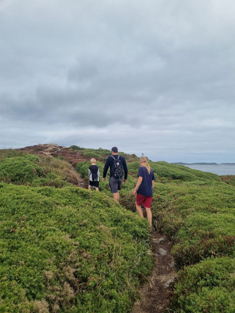 Først gikk vi over til den minste delen, der vi vasset gjennom bregner som rakk oss til skuldrene, og tuslet på små stier omgitt av lyng. Vi så mengder med kaninhull, men ingen kaniner. Et sted fant vi en gammel taregrop, stille og lett å overse, noe selv skiltet sa: Tare pit – easy to miss.