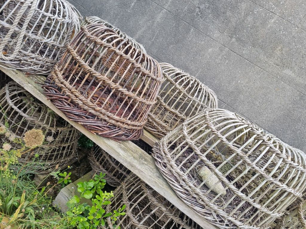 Hummeren vi hadde håpet på å skaffe, lot vente på seg – fiskeren var ikke inne da vi passerte teinene hans. Men vi fikk likevel se de fine, plastfrie redskapene han bruker, håndlaget og solide. Et lite bevis på at man kan høste av havet uten å etterlate seg mer enn bølgeskvulp og spor i sanden.