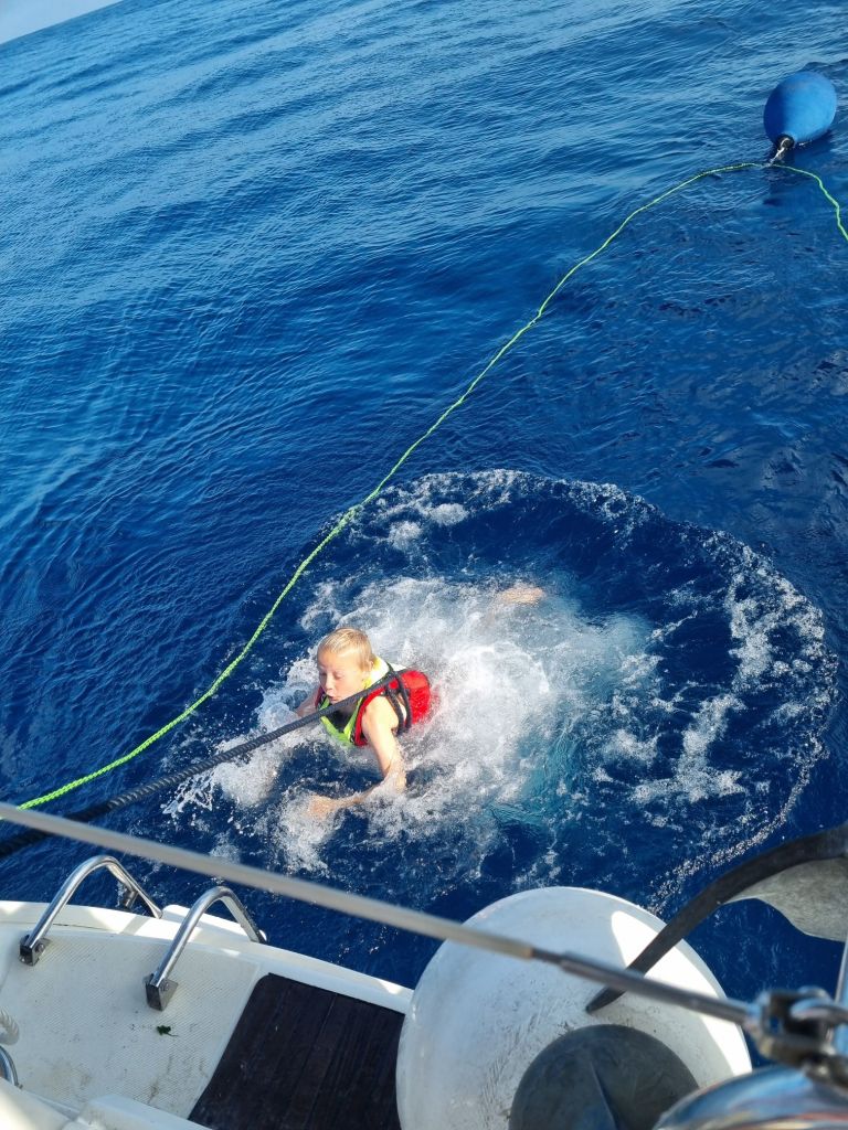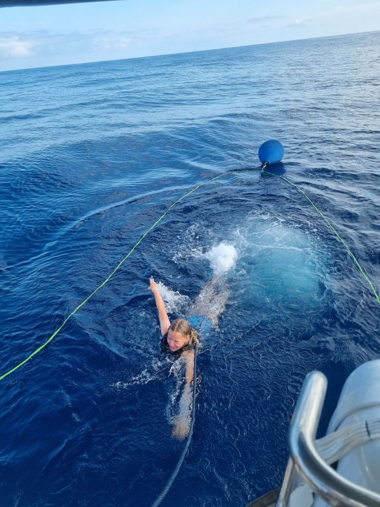 Delfiner fulgte oss flere ganger, og en natt gled en hval forbi, oppdaget under rederinnens nattevakt. Midtveis feiret vi «halvveisfest» med popcorn, brus og godteri – en liten fest midt i Biscaya, avsluttet med et bad – midt ute på 4000 meters dyp. Vannet var overraskende varmt, og følelsen av å ha badet på den dybden var spennende og spesiell.