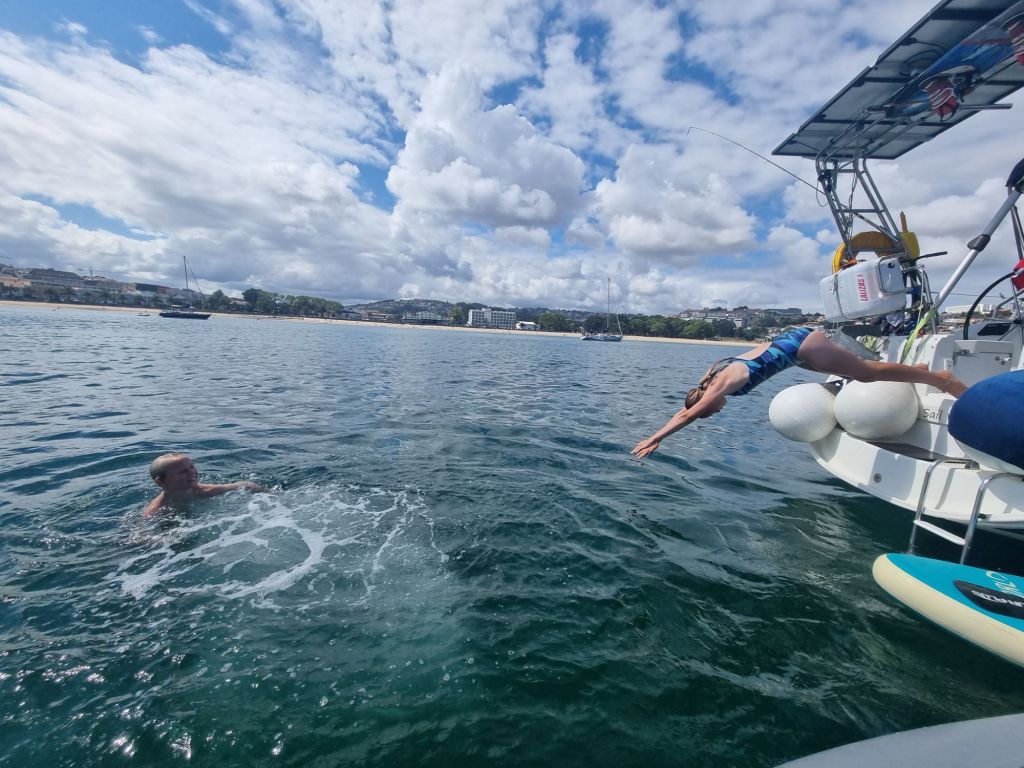 Etter to dager i marinaen satte vi kurs ut for å finne en ankringsplass. Første forsøk ble Playa San Amaro – men etter fire bomforsøk med stein, tang og dårlig feste, ga vi opp og dro videre. Valget falt på Santa Christina, en stor og flott strand der vi ble liggende rolig i tre netter. Dagene fylte vi med handleturer på land, bading fra båten, strandliv, og en felles grillmiddag med gjengen i Explore.