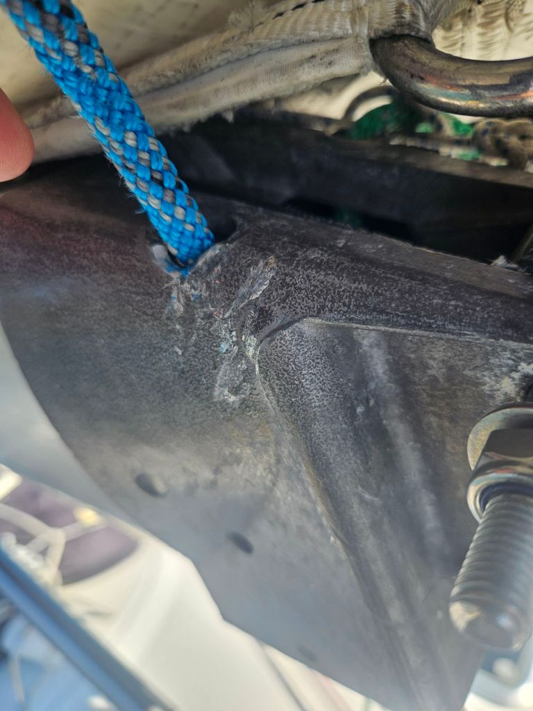 Det viste seg desverre at revelinen som ble flittig brukt i går har fått litt juling(kappen på dynematauet ble gnaget over), og igjen gitt juling til inngangspunktet i bommen(Dynemaen har gnaget seg inn i aluminiumen i bommen, da det manglet en syrefast ring som skulle tatt av for friksjonen fra tauet).