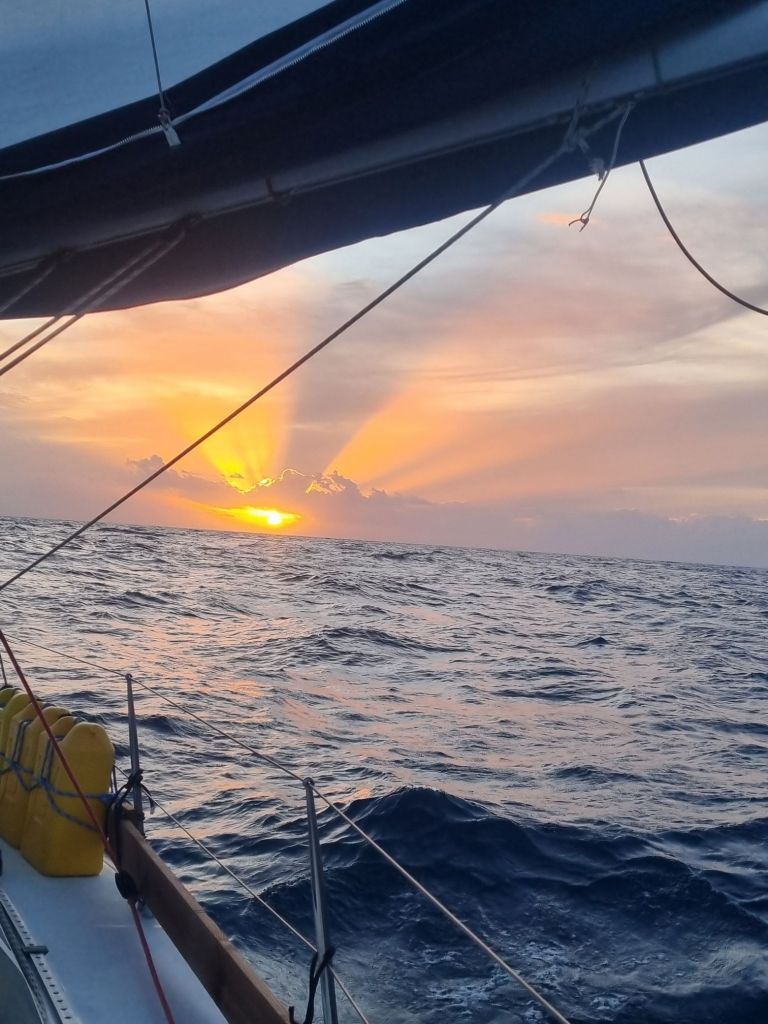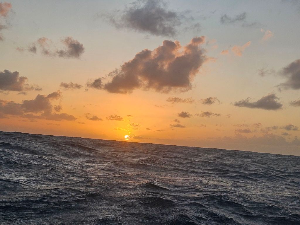 En nydelig soloppgang idag, og når jeg titter på denne tenker jeg på hvor deilig det har vært å være her ute på blåmyra, selv om det til tider har vært litt rotete sjø og noen squals for mange, har det altså vært en ro som vanskelig lar seg sammenligne. De nautiske milene teller fort ned. Mørket faller fort på og vaktrotasjonene starter, men de fleste av oss sliter med å falle til ro i påvente av landfall om noen timer