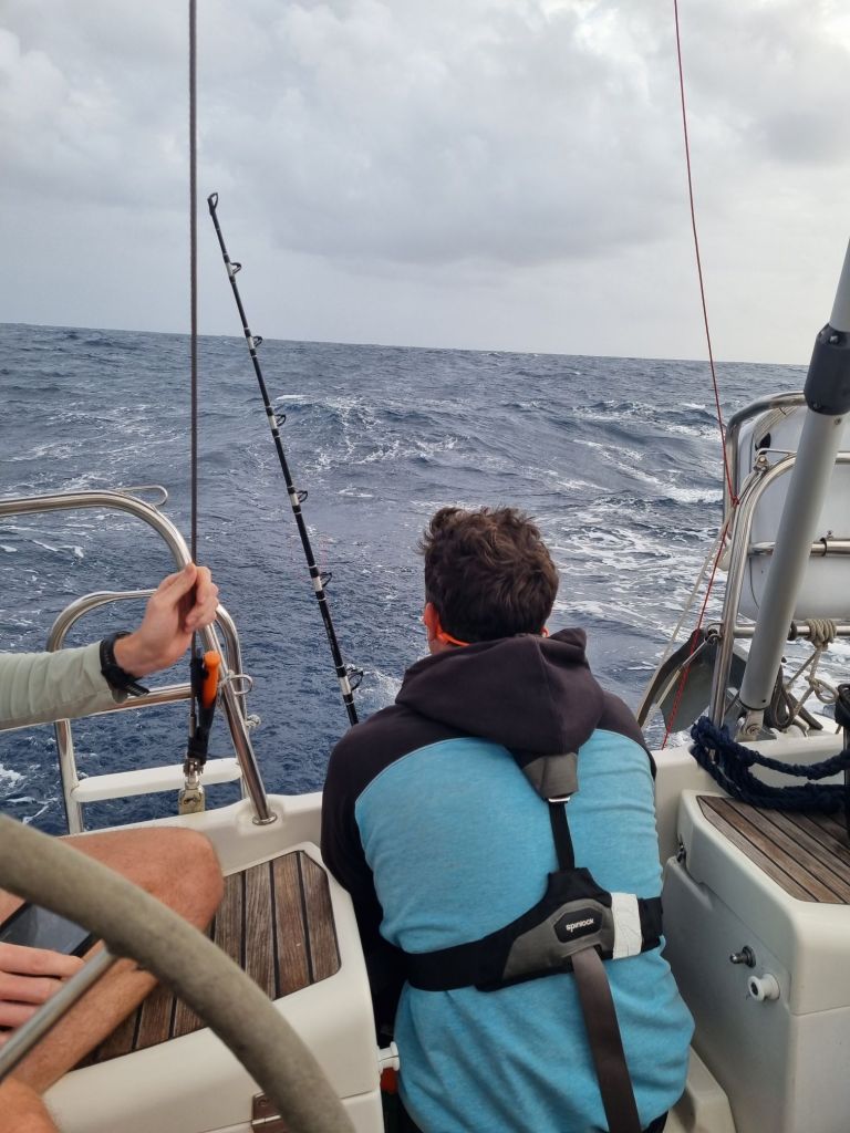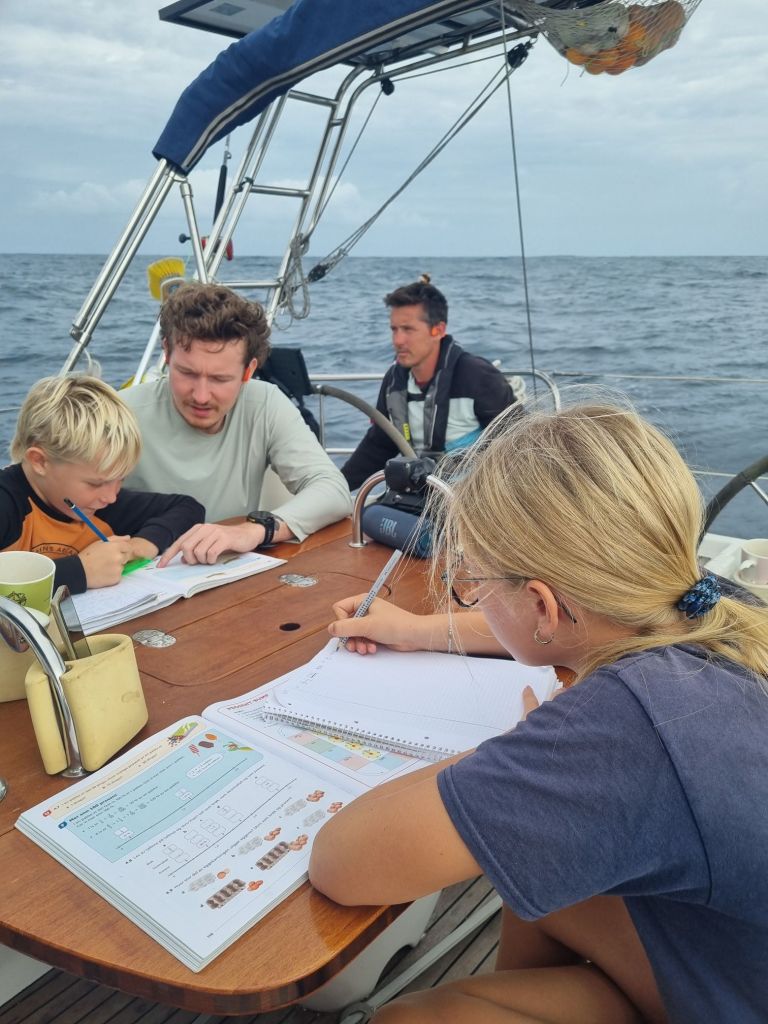 2.rev ble satt før Ane overtok stafettpinnen på nattevaktene, genoaen ble rullet litt inn og ut i de vekslende værforholdene. Alle nattevaktene hadde squal innom rundt båten, men ingen direkte treff, uten om Olav som fikk seg en skikkelig regnskyll. Nattens vinder har tatt oss en del lengre nord enn vi hadde planlagt, men litt etter solen sto opp vred vinden seg litt slik at vi kunne nærme oss den opprinnelige kurslinjen. Til lunsj i dag ble det bananlapper igjen, går mot slutten på bananene og forsåvidt levetiden på de som er igjen, så vi får se om vi har noe igjen til en siste runde i morgen. Alma og Trym har vært flinke med skolearbeidet, og har fullført mattebøkene sine, og har kun litt norsk igjen før vi setter strek for dette skole halvåret.