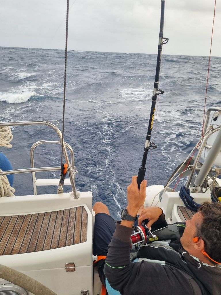 Vi har hatt god fart igjennom natten uten de største behovene for endringer på seilføringen, annet at vi satt det 2.revet på morgenkvisten. Sluken ble også hivd uti i grålysningen, og det tok ikke mange timene før det skrek i snella, og plutselig var hele båten var våken. Forseilet ble rullet inn for å bremse båten, mens fisken ble forsøkt snurret inn. Men denne gangen vant fisken, da sena røyk etter ca en halvtimes dra kamp.