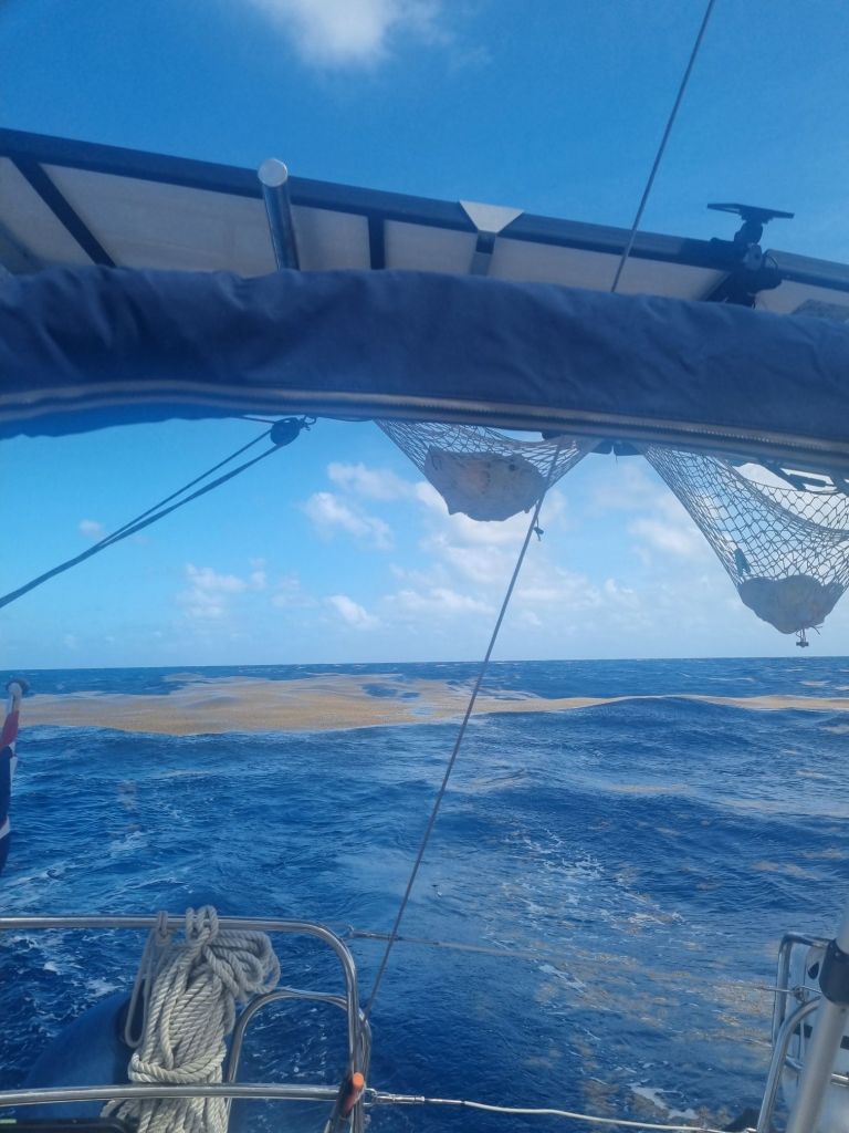 Nattevaktene fikk nok ned å observere squals igjennom natten, ingen direkte trefninger, men båten fikk seg en ferskvannnsskyll, og seilingen ble litt mer krevende da vinden kom å gikk. Når solen gløttet på forsvant alle spor etter squalls og vi kunne forberede oss på dagens høydepunkt, halvveisfest! Dette har vært planlagt av de to yngste matrosene, og det ble både brus, godteri og musikk. Rederinnen disket også opp med bananlapper til lunsj. Fiske i dag ble så som så, da vi kjørte igjennom noen svære felter mer sergassotang, som festet seg i redskapen.