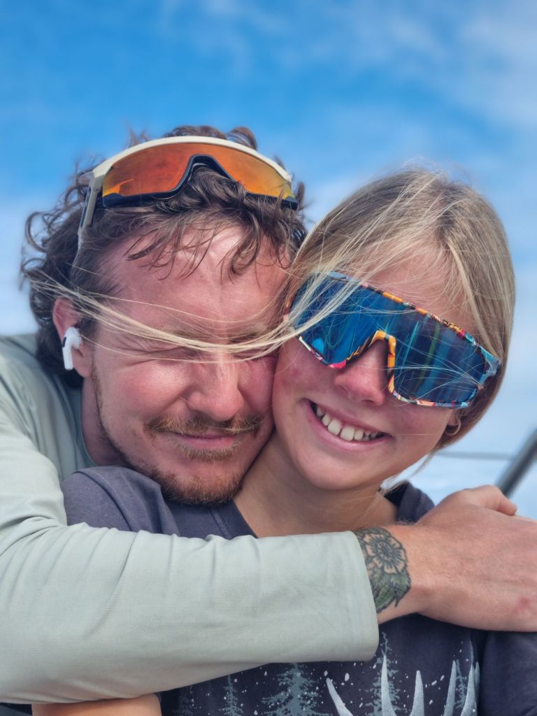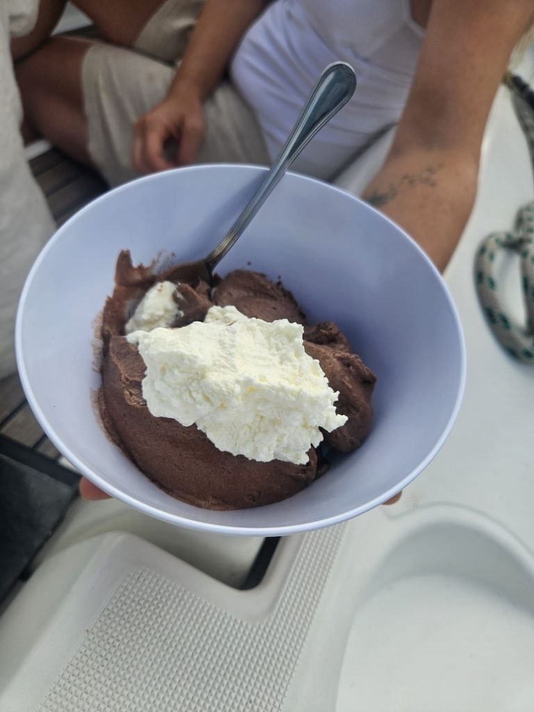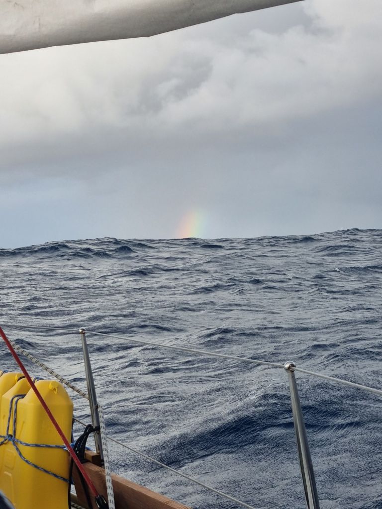 Resterende av nattevaktene forløp seg uten de største squalsa, men noen var det, og når morgenen kom var det meste av salt vasket vekk. Dagen har vært ganske grå med vekslende vindstyrker. Vi gikk er par timer for bb halser for å komme litt sørover igjen, etter å blitt dratt nordover av squalsene. Etter noen timer er vi tilbake på sb halser, med motoren i gang for å toppet litt på batteriene som ikke får for mye lading via sola i dag. Og tilbake på bb halser, får trent litt på jibbing i hvertfall 😅Vi skal også feire 3/4 fest i dag, Alma har blant annet laget sjokolademousse.