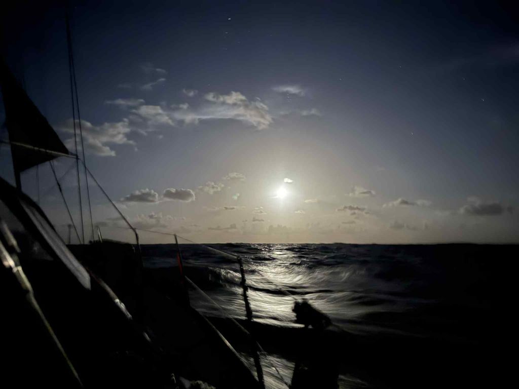 Litt utover ettermiddagen kunne det rulles litt mer ut på genoaen. Vi har hatt god fart i båten, men bølgene er litt lunefulle. Etter å forsøkt å seile litt med kun 1.revet satt etter solnedgangen, måtte vi igjen sette 2. revet, ikke grunnet vind men sjøen er litt krapp og bølger fra to retninger gjør at seilet slår unødig mye. Å sette 2.revet gjør at vi får bommen litt lengre ut og seilet står bedre, selv om straffen er noe lavere fart, sparer det på seil og rigg.