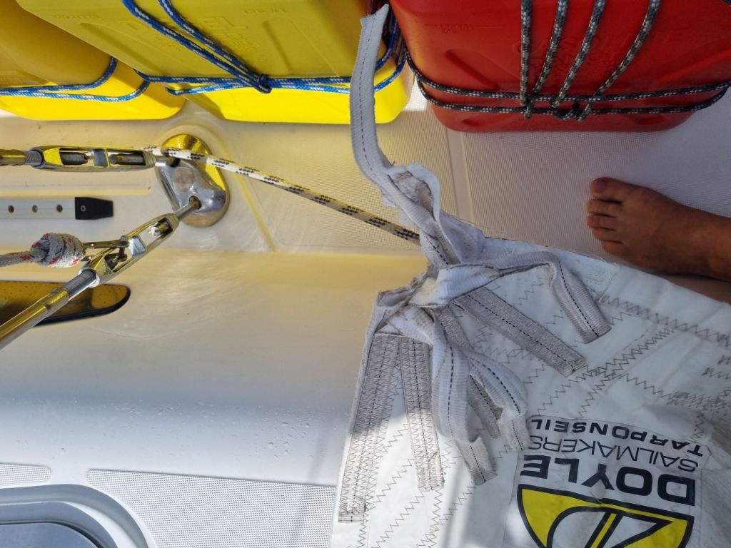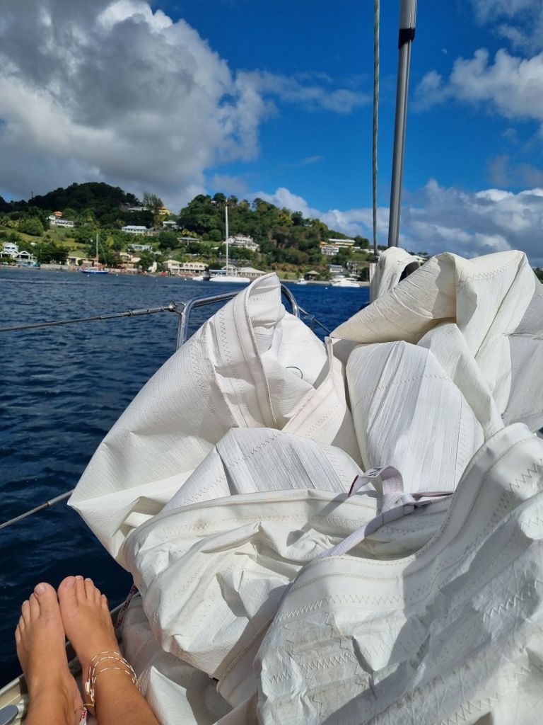 På vei inn til Saint Vincent fikk vi også en påminnelse om at langturseilas sjelden er helt problemfri: skjøtefestet på genoaen røk.