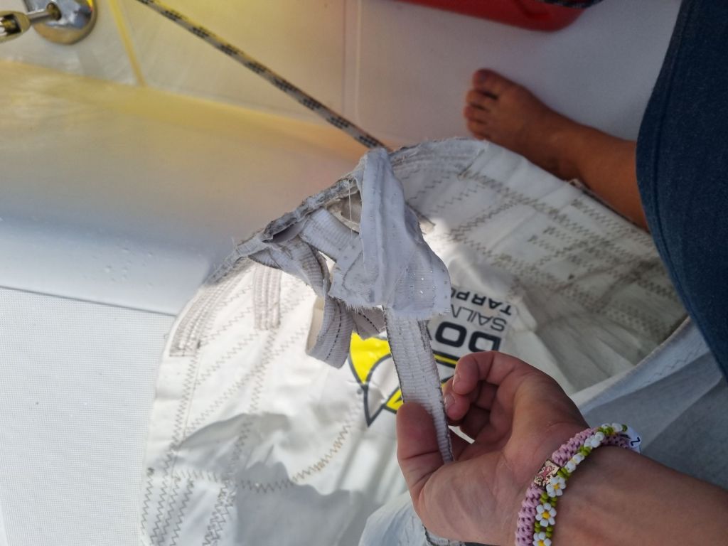 Seilet ble levert til seilmaker – og for en effektiv kar! Allerede dagen etter kunne vi hente et nysydd og helt tipp-topp seil. Akkurat sånn service man blir ekstra glad for når man lever båt-livet.