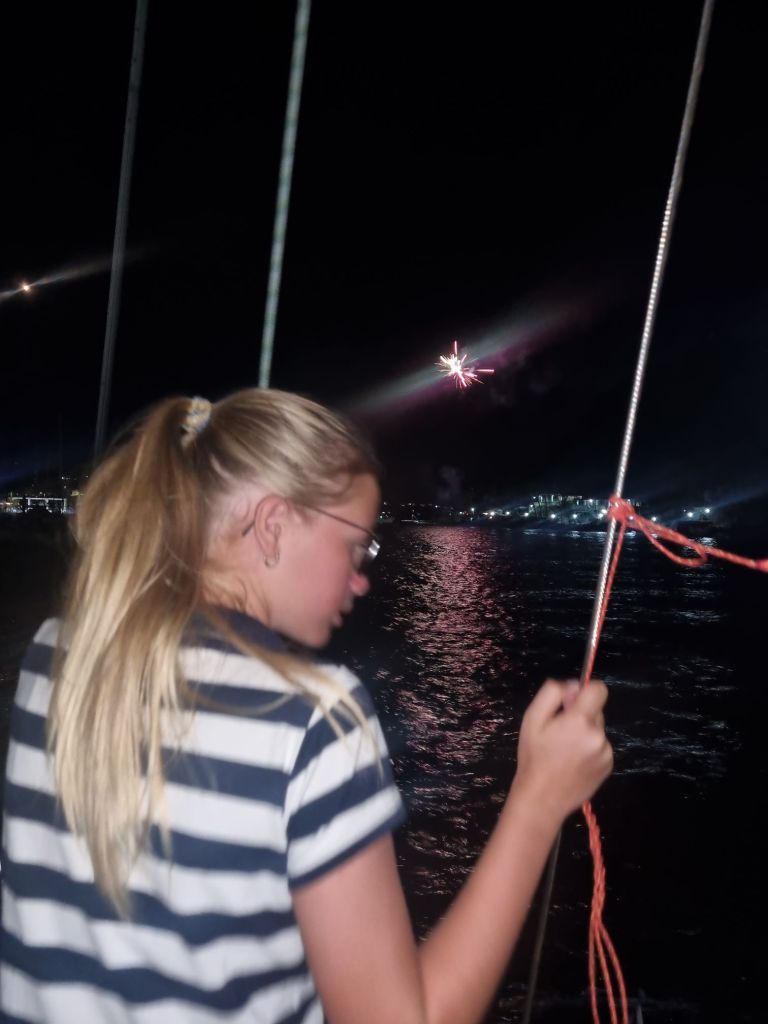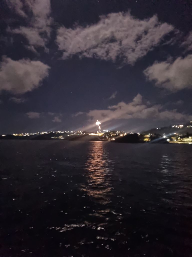 Nyttårsaften feiret vi på restaurant sammen med familiene i båtene Ursa Major og Vue Mer. En rolig og hyggelig kveld med god mat og fine samtaler. Da klokken gikk mot sen kveld, returnerte vi til båtene og så fyrverkeriet lyse opp himmelen fra ankringsplassen. En stille, varm og annerledes overgang til et nytt år.