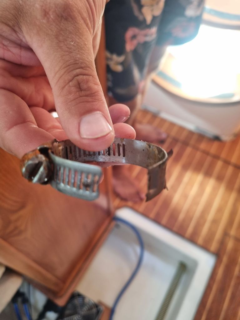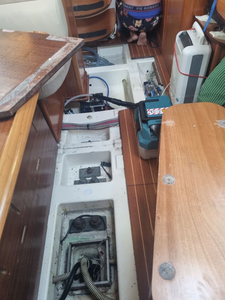 Avreisedagen fikk vi en litt brå start. Litt over fire på morgenen ble vi vekket av lensepumpa. Det viste seg at kjølsvinet – under dørkplater og motor – var fullt av vann. Heldigvis gikk feilsøkingen effektivt, og synderen var “bare” en røket slangeklemme. En enkel fiks, litt tørkearbeid, og noen ekstra kaffekopper senere var vi klare til å seile videre. Veldig godt når slike ting lar seg løse raskt.