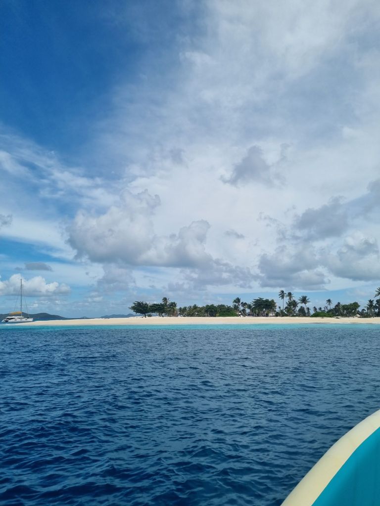 På vei videre mot Union Island, hvor vi skal sjekke ut av Saint Vincent og Grenadinene, tok vi et kort stopp utenfor Palm Island. Her ble det lunsjpause, og ungene og kapteinen svømte i land.