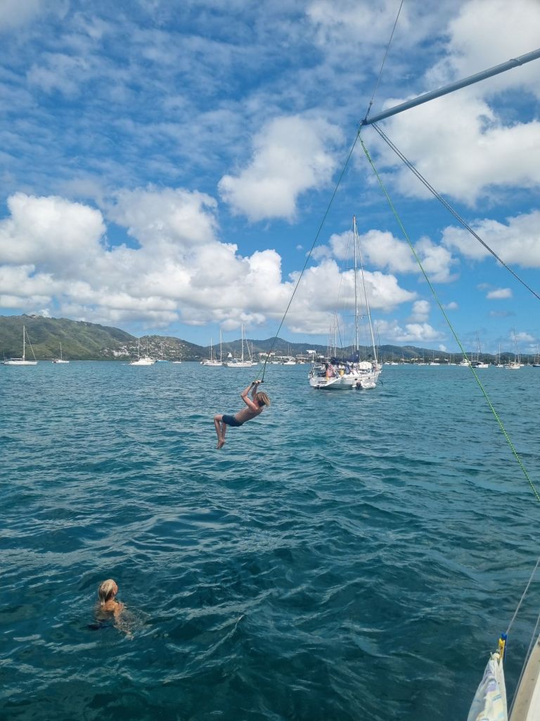 I ca en uke lå vi rolig og nøt dagene, omgivelsene og godt selskap (det ble et gledelig gjensyn med gjengen i Explore, hvor vi fikk vært med og feiret bursdagene til begge de to kvinnene ombord). Vi fikk vært på en lekepark i vannet med oppblåste hinder, trampoliner og sklier, som var moro for store og små (her glemte vi helt å ta bilde, men å slenge seg fra spribommen er jo ikke feil det heller – og det tok vi bilde av).