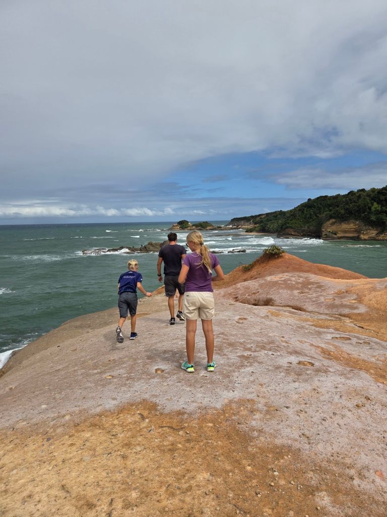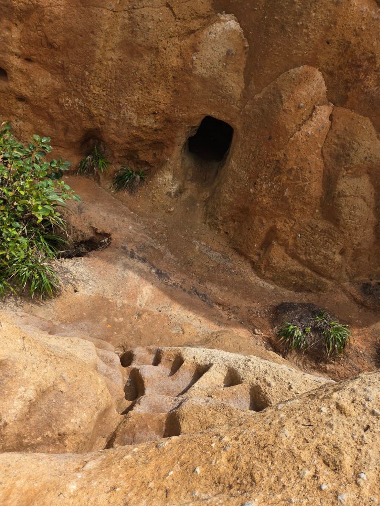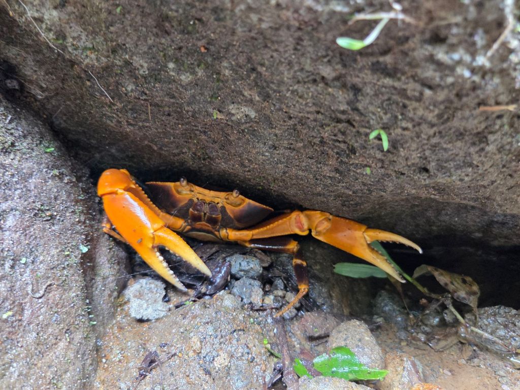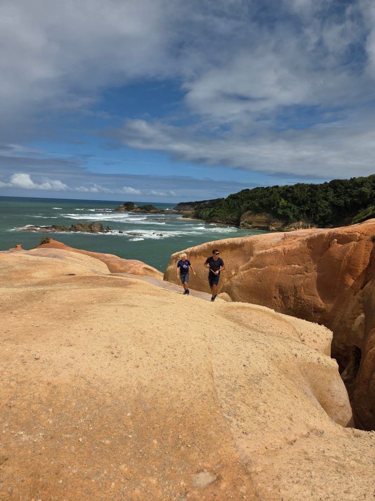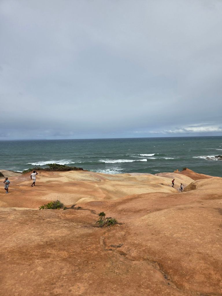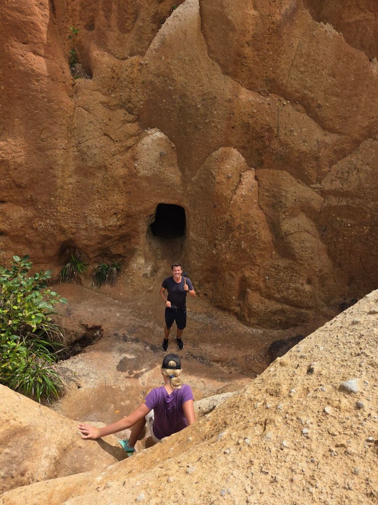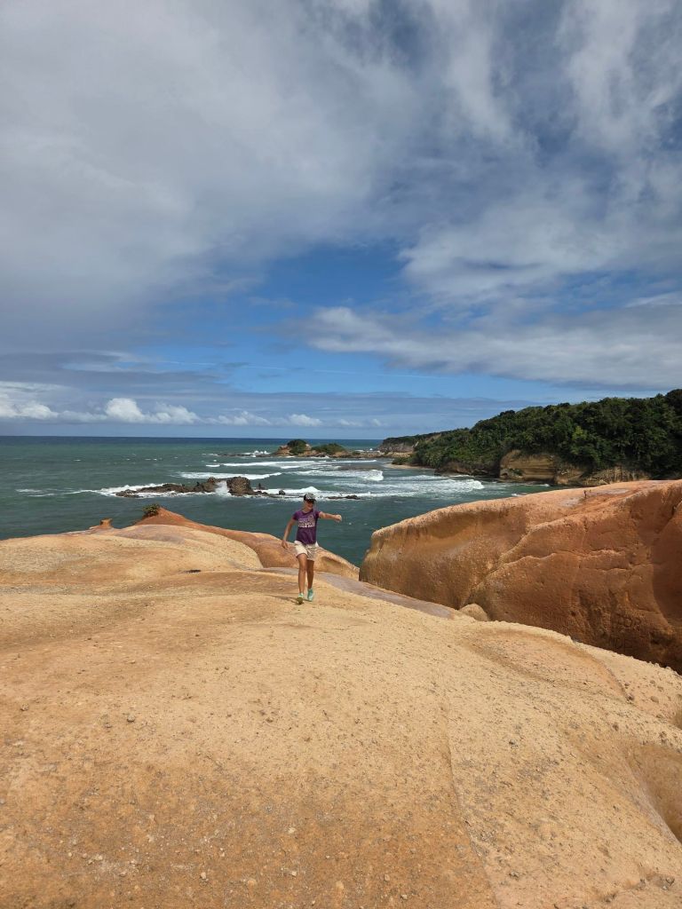 Red Rocks var neste stopp på ruta, et av de mest spesielle landskapene på Dominica, som ligger langs nordkysten nær Calibishie. I stedet for frodig regnskog møtte vi her et rått og nesten uvirkelig kystområde av dype røde og rustfargede steinformasjoner, skapt av gammel vulkansk aktivitet. Fargen kommer fra jernrikt lava som over tid har oksidert – litt som rust – og gir området et nesten “mars-aktig” preg. Vi tuslet rundt på klippene, det var laget trappelignende spor i terrenget, og det var til og med en hule vi kunne gå inn i.