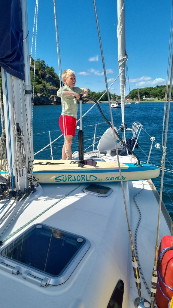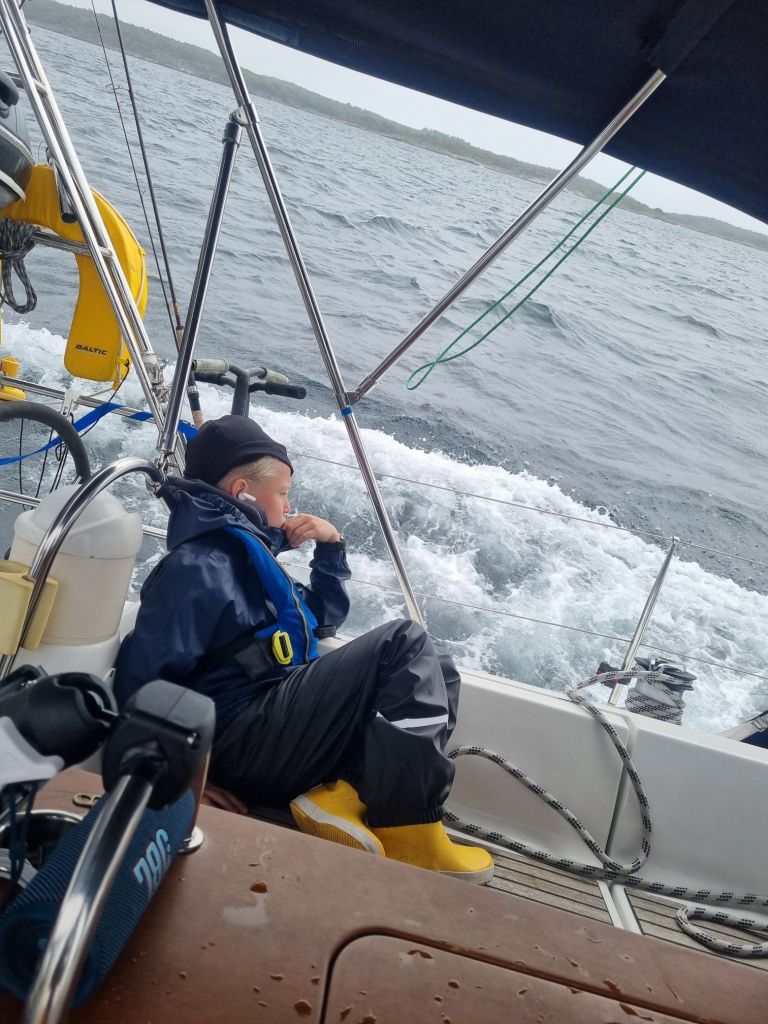 Nå ligger vi i Farsund, hvor vi har hentet noen pakker på postkontoret – og venter på et par til, blant annet et nytt feste til kicken. Samtidig følger vi med på værvinduene for kryssing over til Skottland. Det blir noen dager her, kanskje inne i havna eller på svai rett utenfor, alt etter hva som passer best fra dag til dag. Det er fint å ha litt fast grunn under føttene igjen. Barna koser seg alltid med å utforske land, og vi voksne kjenner at det gjør godt å gå en tur, handle litt og se nye plasser.