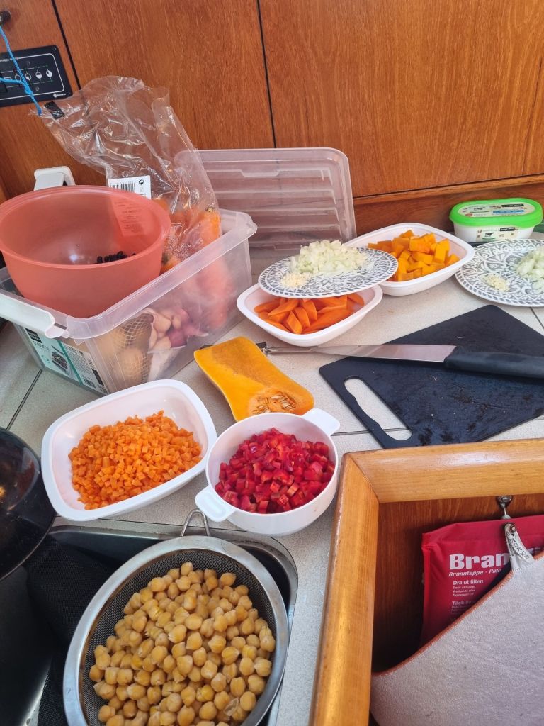 Resterende av nattevaktene forløp seg uten de største squalsa, men noen var det, og når morgenen kom var det meste av salt vasket vekk. Dagen har vært ganske grå med vekslende vindstyrker. Vi gikk er par timer for bb halser for å komme litt sørover igjen, etter å blitt dratt nordover av squalsene. Etter noen timer er vi tilbake på sb halser, med motoren i gang for å toppet litt på batteriene som ikke får for mye lading via sola i dag. Og tilbake på bb halser, får trent litt på jibbing i hvertfall 😅Vi skal også feire 3/4 fest i dag, Alma har blant annet laget sjokolademousse.