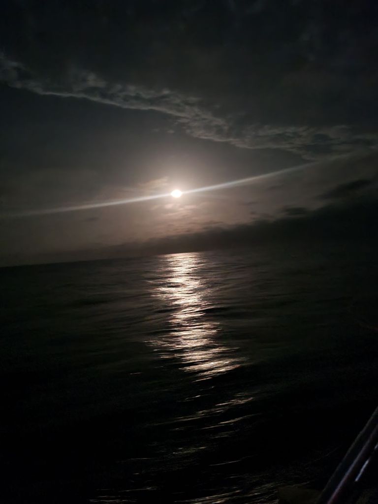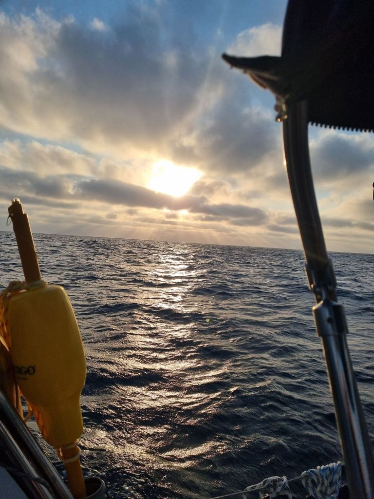 Litt utover ettermiddagen kunne det rulles litt mer ut på genoaen. Vi har hatt god fart i båten, men bølgene er litt lunefulle. Etter å forsøkt å seile litt med kun 1.revet satt etter solnedgangen, måtte vi igjen sette 2. revet, ikke grunnet vind men sjøen er litt krapp og bølger fra to retninger gjør at seilet slår unødig mye. Å sette 2.revet gjør at vi får bommen litt lengre ut og seilet står bedre, selv om straffen er noe lavere fart, sparer det på seil og rigg.