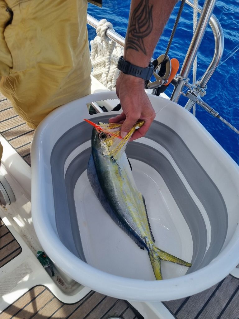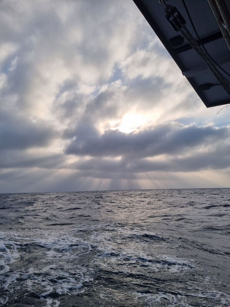 Døgnet forsyver seg litt etter litt når vi har satt vaktene våre etter UTC tid, så det tar litt lengre tid før solen står opp hver dag. Men når først solen gløtter litt, går fiskesnøret i vannet. Nattevaktene har denne natten også gått uten nevneverdige hendelser. Flere bananer når sitt modningspunkt, så deilig bananbrød i dag også 🙌🤤 2 fisker har vært bortom kroken vår i dag også, den ene slapp vi ut igjen, da den ikke var så veldig stor og vi fremdeles har igjen fra gårsdagens fangst, nr 2 frigjorde seg selv før vi rakk å få den ombord. Dagslyset er nå i ferd med å ebbe ut, og nattevaktsrotasjonen trer igang igjen.