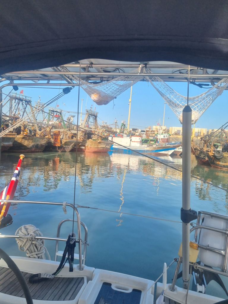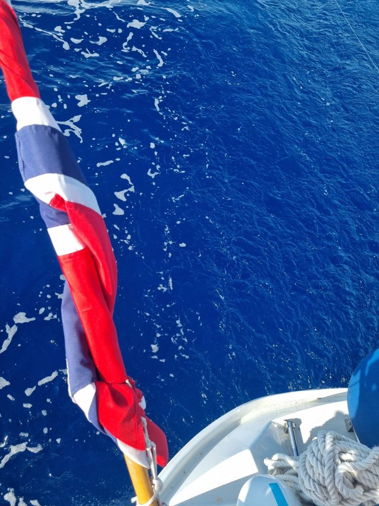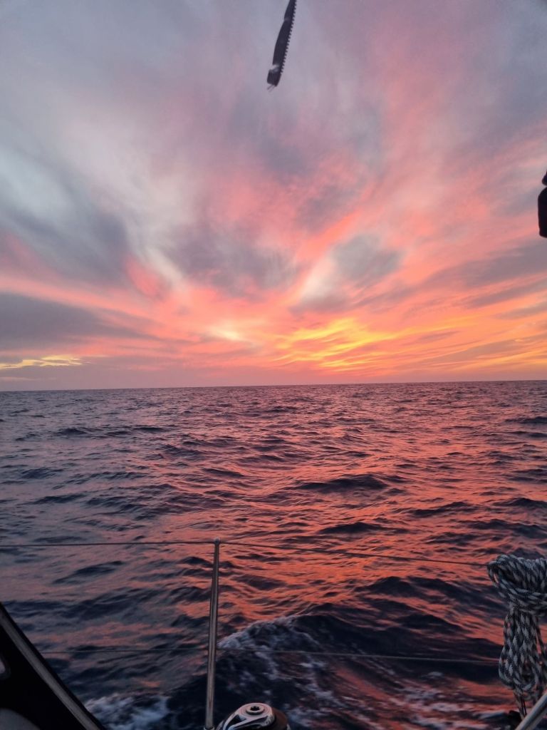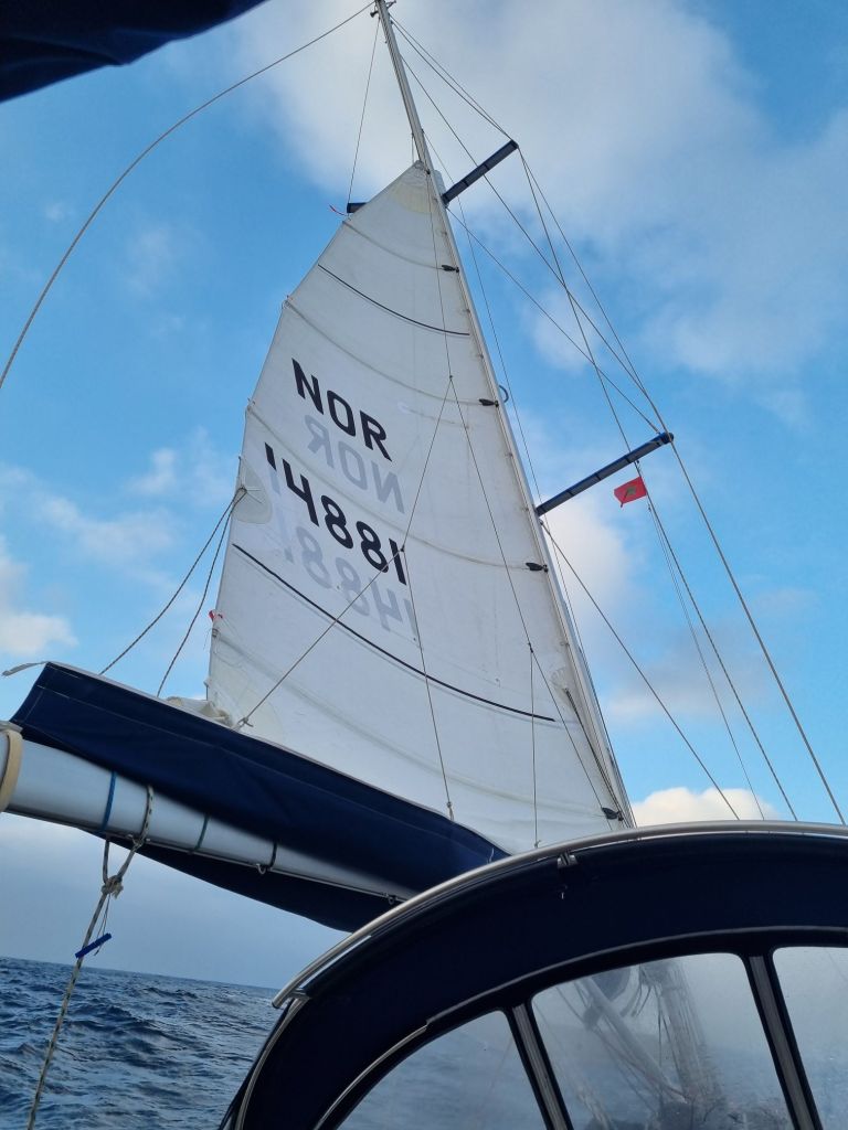 Vi har kastet loss, og nå tar vi fatt på det største strekket vi noen sinne har gjort, ca 2200NM skal forseres 🤯 dagen startet med friskvind og sjø ut fra marinaen, vi gikk for motor de første timene for vi trengte å fylle vanntaker og toppe litt opp på batteriene. Når vi først fikk opp seilene ble storseilet satt med 2 rev og en godt revet genoa, da det blåste opp mot 28knop i kasta.