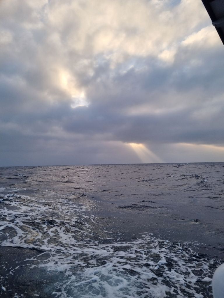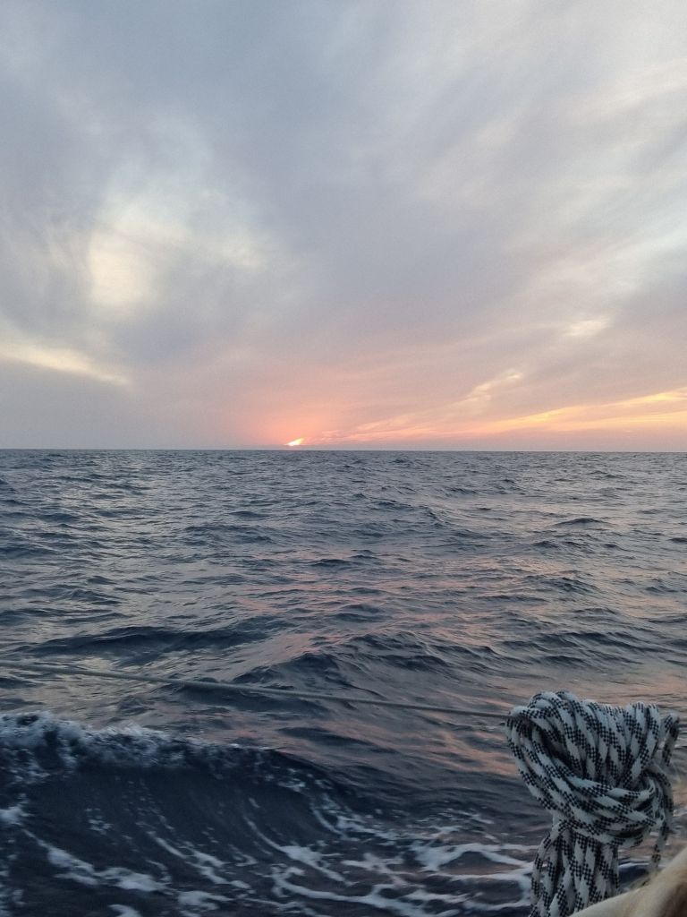 En nydelig soloppgang idag, og når jeg titter på denne tenker jeg på hvor deilig det har vært å være her ute på blåmyra, selv om det til tider har vært litt rotete sjø og noen squals for mange, har det altså vært en ro som vanskelig lar seg sammenligne. De nautiske milene teller fort ned. Mørket faller fort på og vaktrotasjonene starter, men de fleste av oss sliter med å falle til ro i påvente av landfall om noen timer