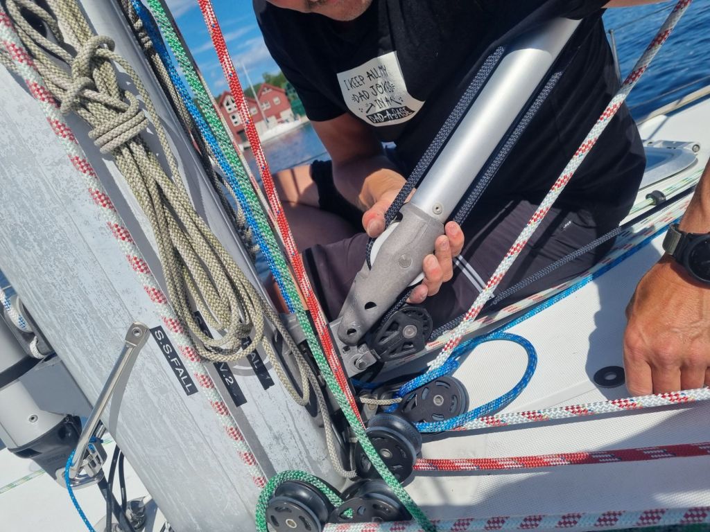 Før avreise rakk Steinar en rask tur opp til butikken han hadde besøkt dagen før, denne gangen for å bytte til lengre skruer til cockpitteltfestet. Med nytt feste på plass ble teltet fikset i en fei – og det føltes godt å vite at vi nå står litt bedre rustet for neste runde med regn på svai.